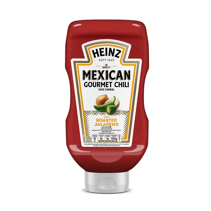 Heinz Mexican Gourmet Chili 325 gr inspired by authentic Mexican jalapeno chili Chili with a light spiciness level combined with the aroma of roasted jalapeno chilies gives a unique and distinctive taste sensation of Chili Gourmet